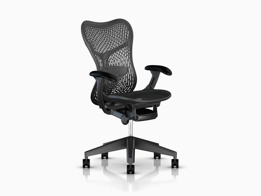 Por uma opção menos cara (que, sabemos, ainda não é barata), Perna gosta da cadeira Mirra da Herman Miller porque tem uma malha nas costas como a Aeron. “A malha respira, é dinâmica, meio que se curva e se move com você” ao longo do dia conforme você muda de posição, diz ele. Esta cadeira tem outras características ergonômicas semelhantes às do Aeron, a saber: braços ajustáveis, ângulo do assento e suporte lombar.