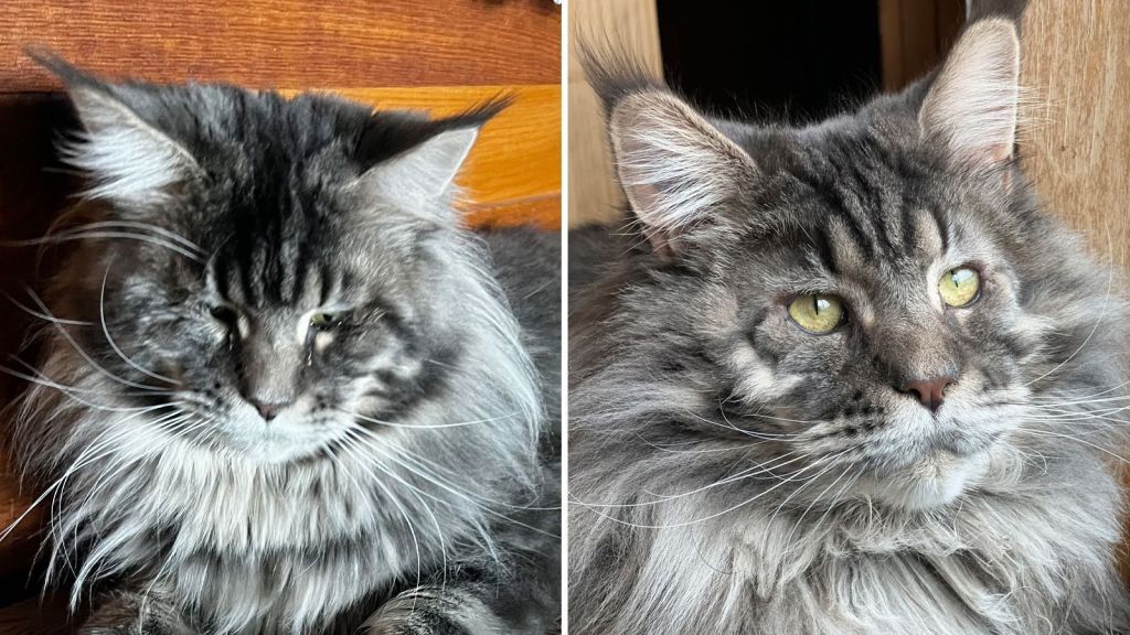 Um Maine coon de 6 meses chamado Jinxy frequentemente mantinha seus olhos doloridos fechados até que seu dono o levou a um especialista em Atenas, Geórgia, treinado para realizar cirurgias complexas nas pálpebras.